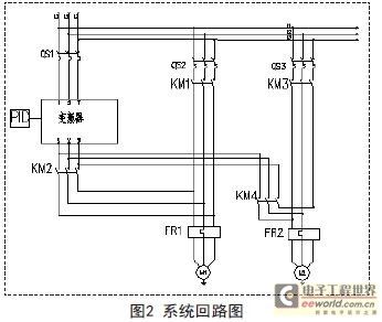 系統(tǒng)采用手動(dòng)和自動(dòng)兩種控制方式,PLC首先使主水泵變頻啟動(dòng),壓力傳感器將母管壓力反饋給PLC,與預(yù)先設(shè)定的給定壓力比較,通過(guò)PID運(yùn)算,調(diào)節(jié)變頻器的輸出頻率,以維持水壓恒定。若用水量大到1臺(tái)水泵全速運(yùn)行也不能達(dá)到給定壓力時(shí),PLC將該水泵由變頻運(yùn)行投入到工頻運(yùn)行,同時(shí)將另一臺(tái)水泵投入到變頻運(yùn)行,增加管網(wǎng)供水量以保證壓力穩(wěn)定。當(dāng)用水量減少時(shí),PLC首先將工頻運(yùn)行的泵停掉,減少供水量,整個(gè)系統(tǒng)保證變頻運(yùn)行時(shí)只有1臺(tái)泵變頻恒壓供水。系統(tǒng)采用變頻泵循環(huán)方式,以“先開(kāi)先關(guān)”順序關(guān)泵,既保證了系統(tǒng)有備用泵,又有效的防止備用泵長(zhǎng)期不用出現(xiàn)“繡死”現(xiàn)象。系統(tǒng)主電路圖如圖2所示。
