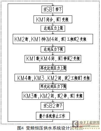 根據(jù)恒壓供水操作要求,PLC控制系統(tǒng)要隨時(shí)監(jiān)控自來(lái)水以及供水口的情況來(lái)決定是否要起動(dòng)水泵,PLC控制程序設(shè)計(jì)的主要任務(wù)是接收各種外部開(kāi)關(guān)量信號(hào)的輸入,判斷當(dāng)前的供水狀態(tài)、輸出信號(hào)去控制繼電器、接觸器、等的動(dòng)作,進(jìn)而調(diào)整水泵的運(yùn)行。PLC和變頻器是本系統(tǒng)的核心部分,系統(tǒng)穩(wěn)定運(yùn)行的關(guān)鍵取決于PLC程序的合理性和可行性以及變頻器參數(shù)的設(shè)定。本系統(tǒng)采用手動(dòng)或自動(dòng)兩種工作方式,系統(tǒng)啟動(dòng)后,泵1首先進(jìn)人變頻運(yùn)行,當(dāng)檢測(cè)到壓力上限信號(hào)時(shí),變頻泵切換為工頻,啟動(dòng)另一臺(tái)泵變頻運(yùn)行,當(dāng)檢測(cè)到壓力下限信號(hào)時(shí),工頻泵切除,僅變?yōu)樽冾l泵工作,系統(tǒng)設(shè)計(jì)程序流程圖如圖4所示。
