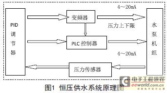 系統(tǒng)采用兩水泵進(jìn)行供水,系統(tǒng)由變頻器控制水泵將水直接加壓或減壓送至管網(wǎng)出口,根據(jù)測(cè)得的管網(wǎng)出口處的壓力,由壓力傳感器將壓力信號(hào)送入PID調(diào)節(jié)器,PID調(diào)節(jié)器根據(jù)壓力設(shè)定值與壓力實(shí)際值的偏差,對(duì)壓力進(jìn)行PID調(diào)節(jié),輸出頻率給定信號(hào)IRF(4~20mA)給變頻器,變頻器根據(jù)頻率給定信號(hào)IRF控制水泵的轉(zhuǎn)速,并在PID調(diào)節(jié)器上設(shè)定壓力的上下限,PID將此信號(hào)送入PLC控制器,從而實(shí)現(xiàn)兩臺(tái)水泵之間的工頻、變頻的切換。其系統(tǒng)原理圖如圖1所示。
