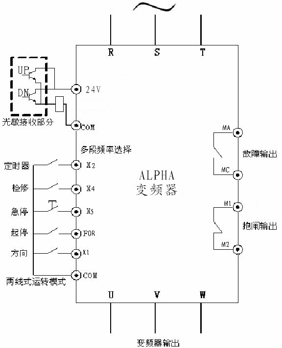 用兩臺ALPHA3300 通用型變頻器控制自動扶梯的電機,載客運行時變頻器設(shè)置為外端子控制,速度控制設(shè)置為多段方式,即設(shè)置正常運行頻率(50Hz)﹑減速運行頻率(15Hz)。檢修(爬行)時,運行頻率較低,大約在25Hz 左右。
