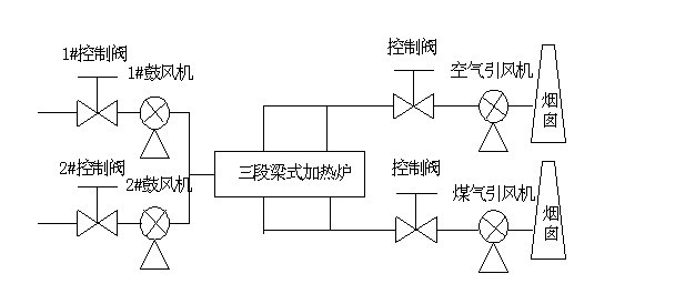 中寬帶作業(yè)區(qū)采用三段梁式加熱爐,送風量靠進風閥調(diào)節(jié),鼓風機設計為一用一備,24小時運行。在正常生產(chǎn)加熱冷鋼壞時,鼓風機進風閥開度為70~80%,送風壓力保持在4.5kPa左右,確保爐膛加熱溫度。在加熱熱鋼壞時鼓風機進風閥開度為50~60%,送風壓力保持在4.5kPa左右,在加熱爐保溫時送風量需求更少,進風閥開度再相應減小,送風壓力保持在4.2kPa左右。,煤氣排煙和空氣排煙風量靠進風閥調(diào)節(jié)。在正常生產(chǎn)加熱冷鋼壞時,煤氣排煙風機空氣排煙進風閥開度為70~85%,在正常生產(chǎn)加熱熱鋼壞時,煤氣排煙風機空氣排煙風機進風閥開度為50~60%,在加熱爐保溫時,則兩臺風機進風閥開度則為30%??諝馀艧燂L機煤氣排煙風機進風閥開度根據(jù)軋鋼速度軋鋼大小做調(diào)整保證爐膛內(nèi)溫度的均恒,兩者的排煙溫度控制在100℃以內(nèi),超180℃報警,加熱爐風機工藝簡圖如下: