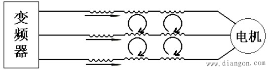 從上圖可以看出,變頻器產(chǎn)生的輻射干擾對周圍的無線電接收設(shè)備產(chǎn)生強烈的影響,傳導(dǎo)干擾使直接驅(qū)動的電機產(chǎn)生電磁噪聲,使得銅損、鐵損大幅增加,同時傳導(dǎo)干擾和輻射干擾對電源輸入端所連接或鄰近的電子敏感設(shè)備有很大的影響。