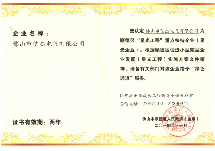 發(fā)布時(shí)間:2015-04-10 09:25:18瀏覽次數(shù):2266熱烈慶祝:佛山市信杰電氣有限公司在各界好友客戶的支持與擁護(hù)下連續(xù)獲得“星光企業(yè)”光榮稱號(hào)。